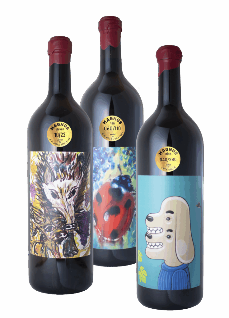MAGNUS Eleven Grande Reserve 1,5,3 a 5L , je v poradí tretia edícia vín pre ktoré etiketu navrhla a namaľovala slovenská maliarka a kurátorka Juliana Mrvová. Spojenie dokonalej chuti Merlotu ktorý dozrieval 24. mesiacov v Barrique sudoch a Cabernet Franc dotvára spolu s umeleckým dielom harmóniu a balzam pre všetky zmysly.